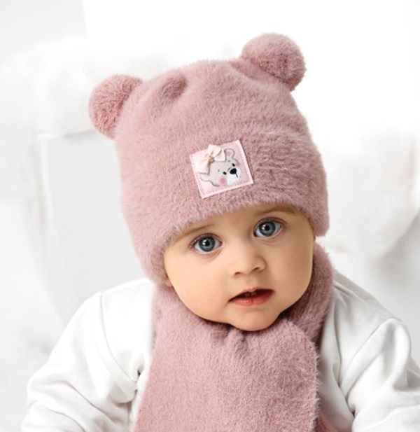 Zimný set s krásnym huňatými brmbolcami. Dvojvrstvová čiapka je na viazanie so šálikom. Zdobenie náševkou so striebornou mašličkou. Vhodná na 3-6 mes.