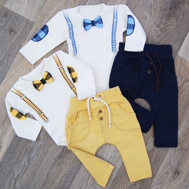 Štýlové dojčenské body s motýlikom a trakmi. Body je ušité z jemnej 100% bavlny. Elegantné body je určená bábätkám a malým fešákom.