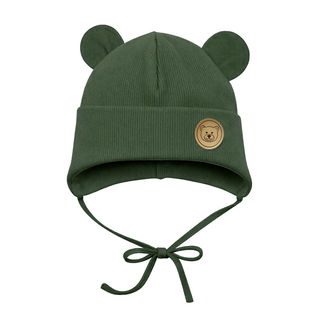 Jednovrstvová čiapočka v krásnej tmavo zelenej. Výborná na prechodné obdobie. Jemný rebrovaný dizajn nevyzerá len skvele, ale poskytuje aj extra vrstvu tepla, ktorá je v jarných mesiacoch neoceniteľná. Zdobenie milými uškami a koženou náševkou medvedíka. Čiapka je na viazanie. Sedí na 9 mes. až 5 rokov.
