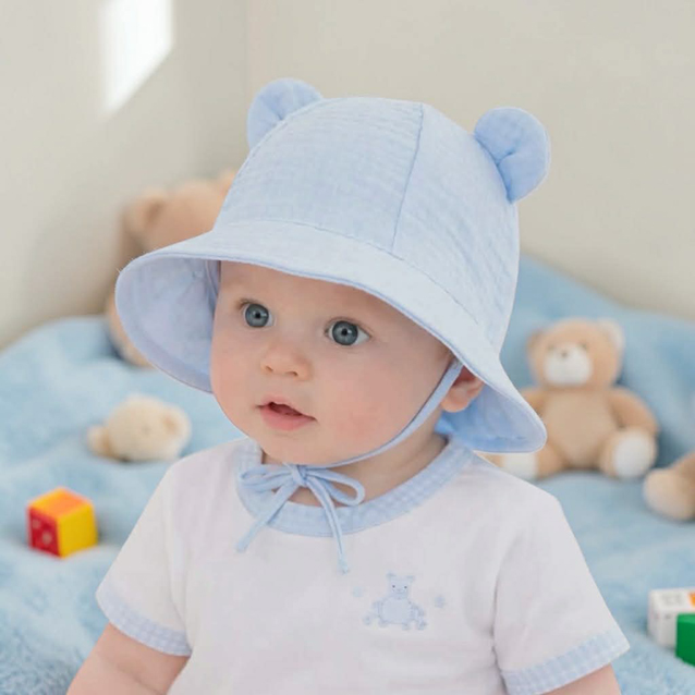 Lupienkový klobúčik Alica s uškami na viazanie – nežná ochrana pre najmenších. Vyrobený z jemného mušelínu, ktorý je ľahký, priedušný a ideálny na teplé dni. Vďaka zadnej gumičke perfektne drží na hlavičke a nevykĺzne ani pri pohybe.