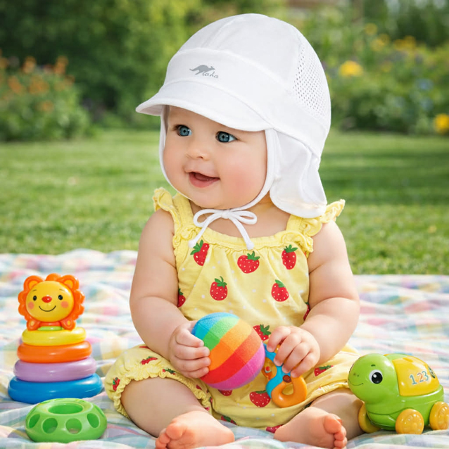 Vzdušná letná čiapka na viazanie, ktorá dokonale chráni krk a citlivé miesta vášho bábätka pred slnkom. Ideálna na hry v piesku či pri vode, spoľahlivo zabráni spáleniu. Pohodlný strih a priedušný materiál zabezpečia maximálny komfort. Vhodná pre deti od 6 do 18 mesiacov