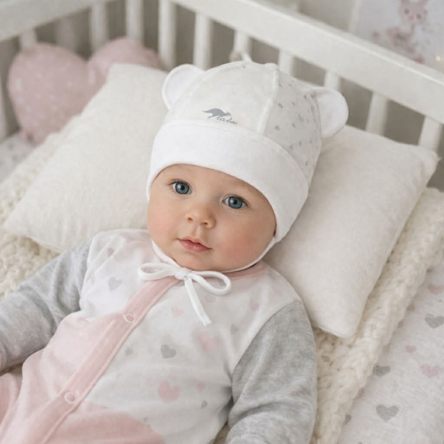 Jemná, priedušná a navrhnutá s láskou – letná čiapka Tami Hearts s drobnou potlačou srdiečok je ideálna pre teplé dni. Dierkovaný úplet zabezpečuje optimálne vetranie, vďaka čomu sa hlávka bábätka neprehrieva. Čiapka má viazanie pod bradou, takže dobre drží. Vyrobená je z kvalitného materiálu, ktorý zaručuje jemnosť, pružnosť a komfort pri nosení.