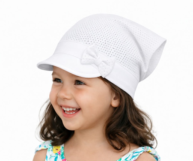 Viac infoLúče slnka ju pohládzajú a dievčatká ju milujú. Dierkovaná šatka so šiltom. Vhodná od 1 do 6 rokov, podľa obvodu hlavy. Šatka je vzadu zošitá, pekne tak drží na hlavičke.