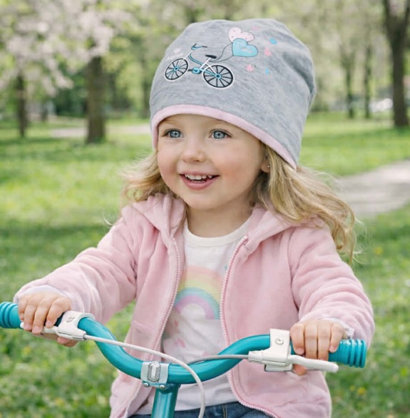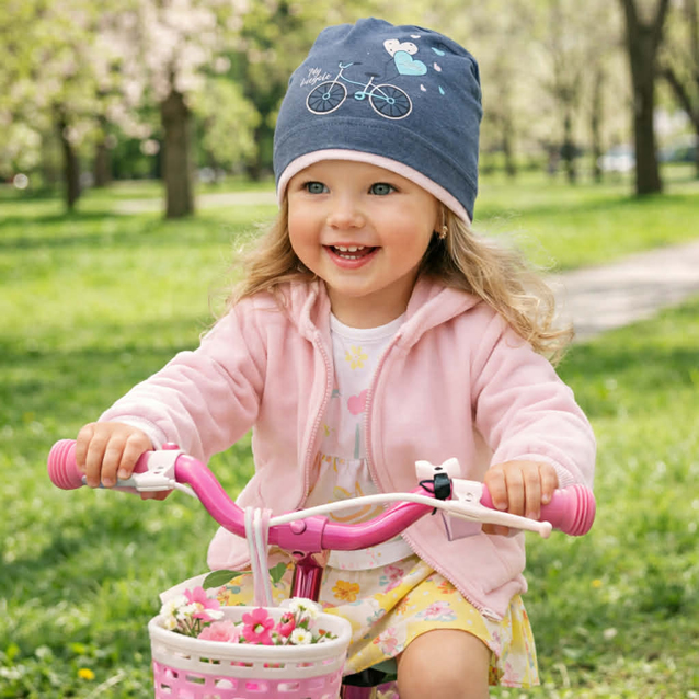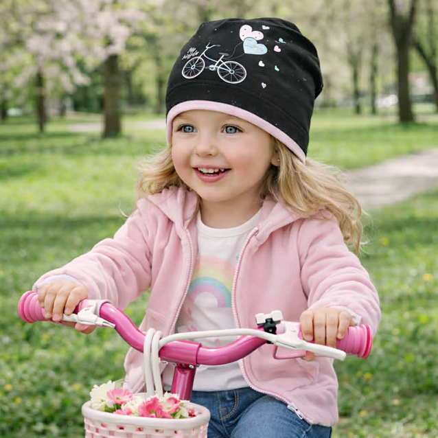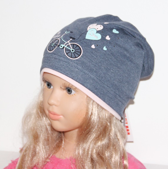 Jednovrstvová čiapka predlžená. Prechodná čiapka pre dievčatko. Zdobená pekným bicyklovým motívom.Super na obdobie jeseň- jar.
