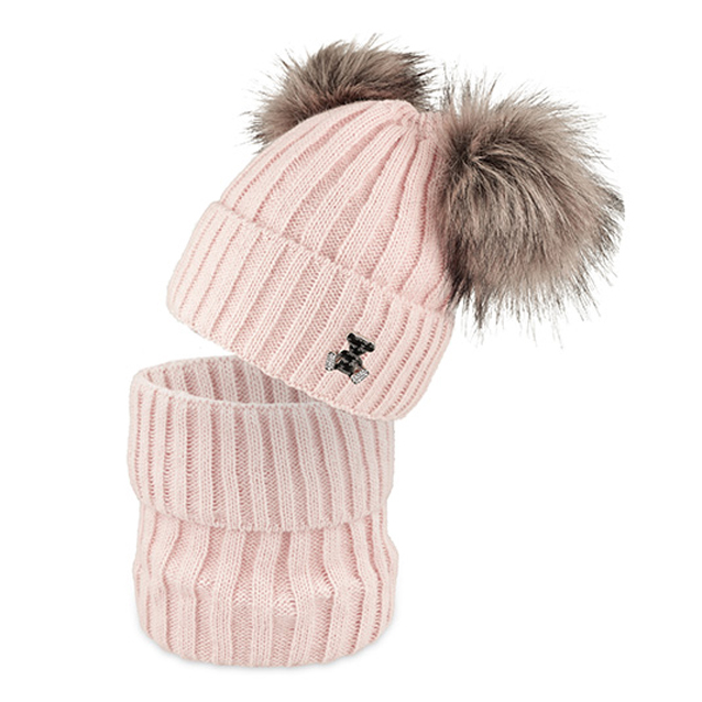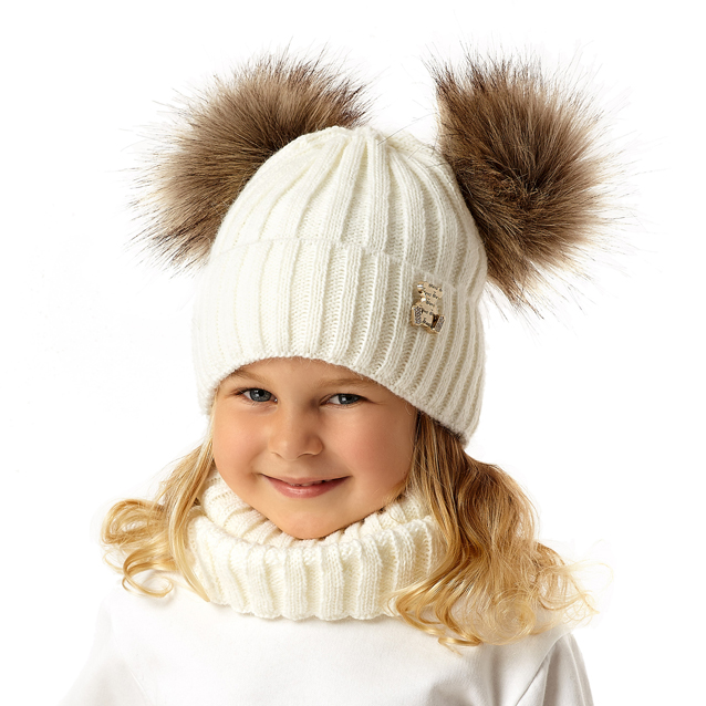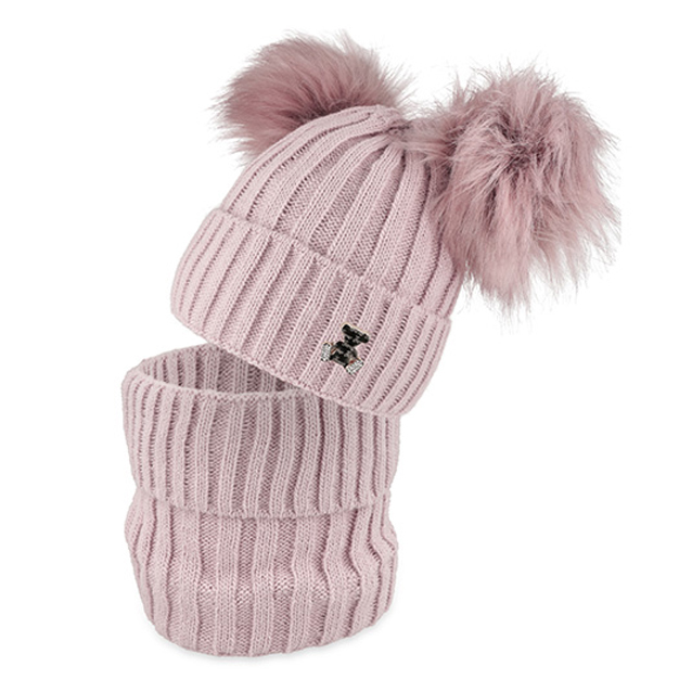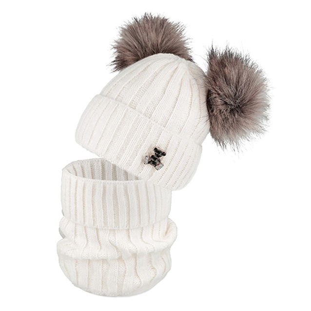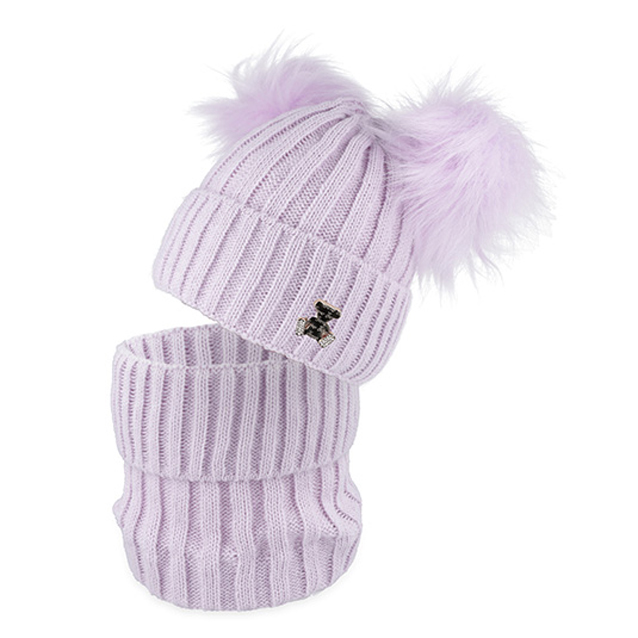 Dievčenská čiapka dvojvrstvová podšitá nasúvacia Čiapka má lem. Teplúčky pletený golier, ktorý krásne ladí. Mäkký pletený vzor čiapky zdobený krásnymi brmbolcami. Nádherné zdobenie kovovým medvedíkom v prednej časti.